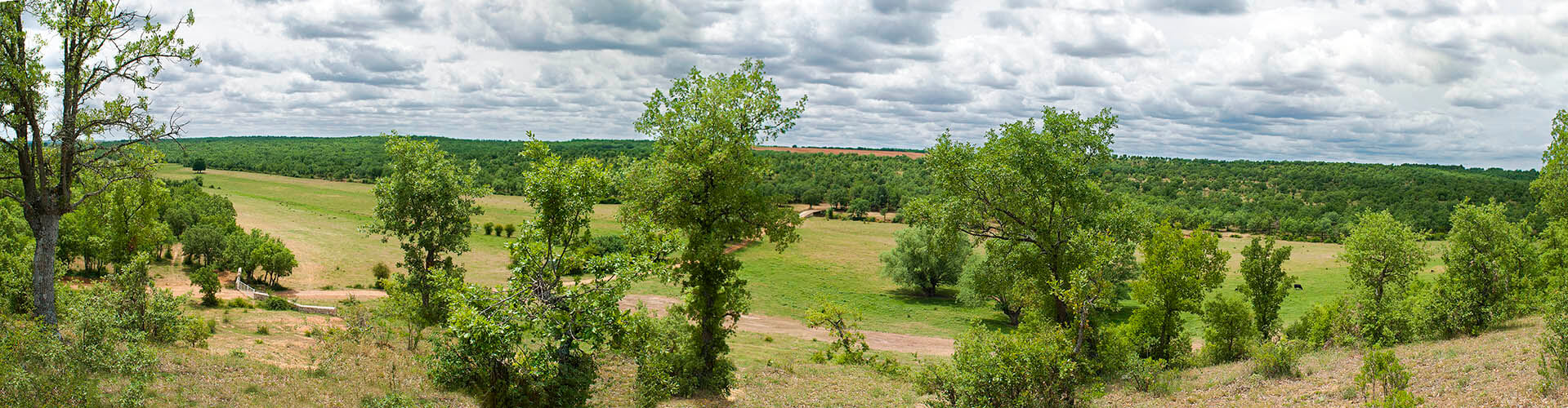 La finca combina amplias praderas y robles adehesados, que sirven de abrigo y refugio natural a las reses que pastan libremente por sus cercados, a lo que se suman sus condiciones orográficas, una climatología limpia y sana y, sobre todo, abundante agua en forma de arroyos y manantiales que riegan y abastecen de norte a sur toda su extensión.